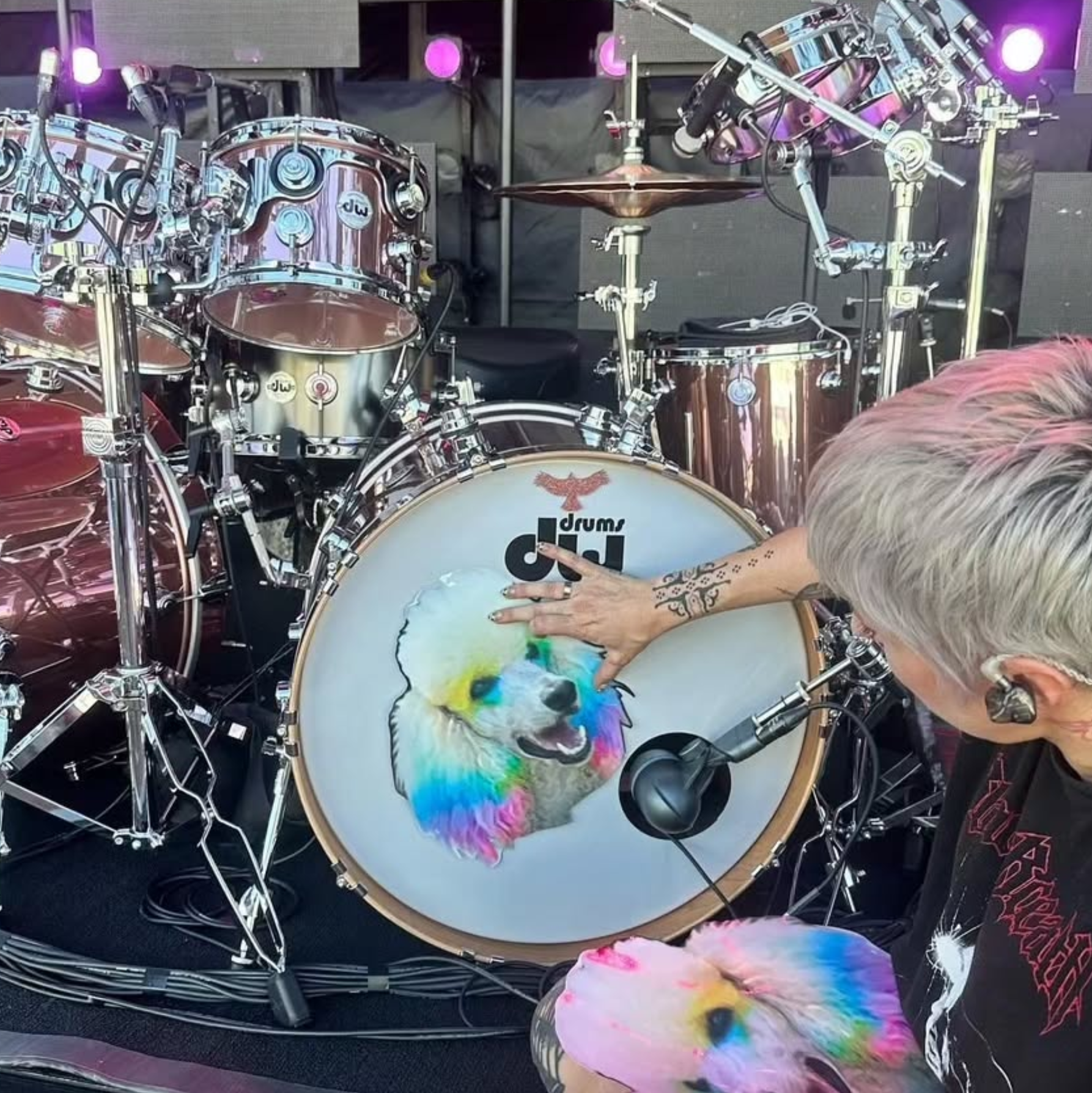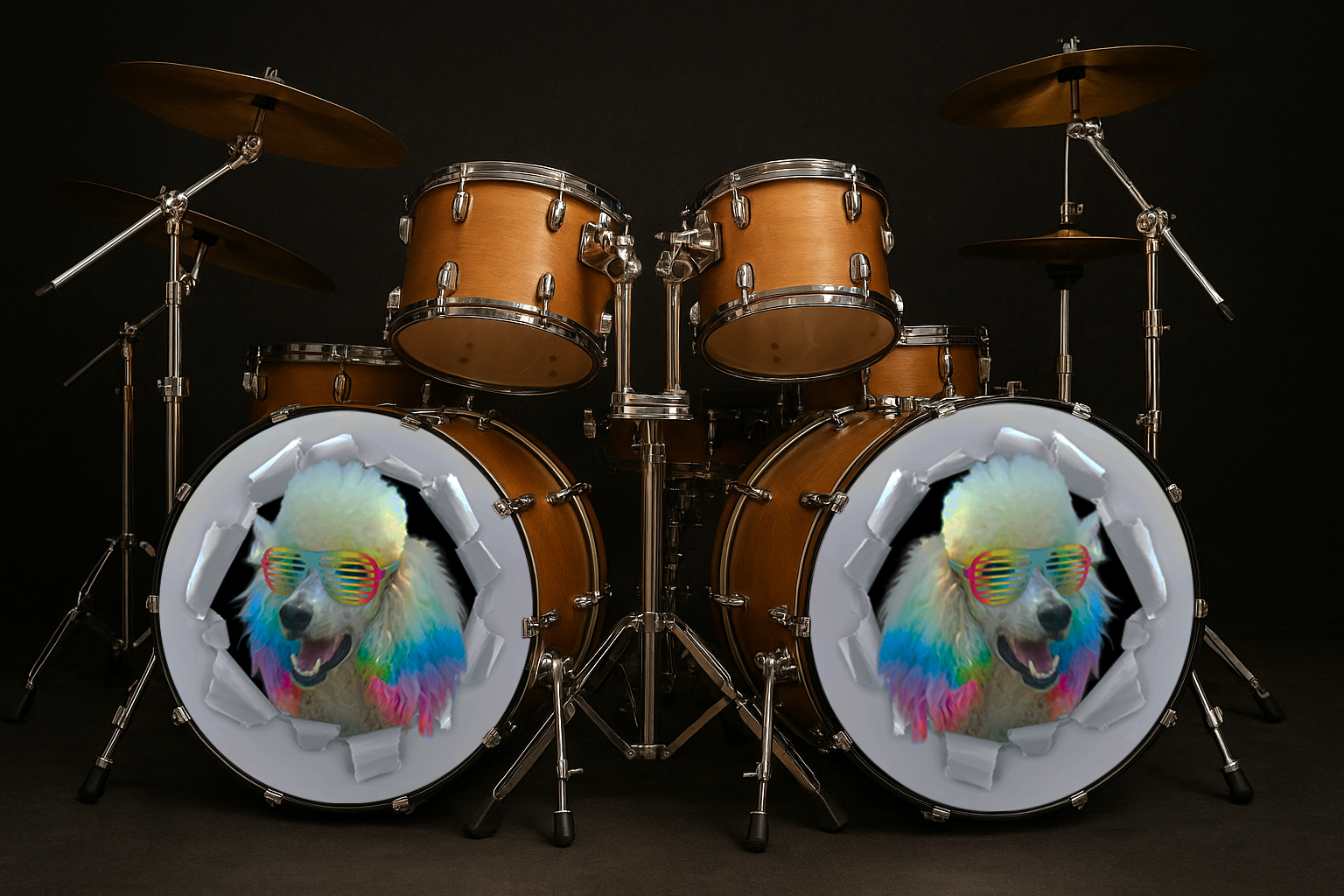 For this project, I created a series of custom drum skin designs for Josh Freese, drawing inspiration from his well-loved poodle artwork. The challenge was capturing the charm and attitude of the original character while adapting it into strong, high-impact graphics suited for a live performance environment. The finished pieces combine expressive illustration with clean layout work, giving his drumkit a distinctive, playful identity that stands out on stage.